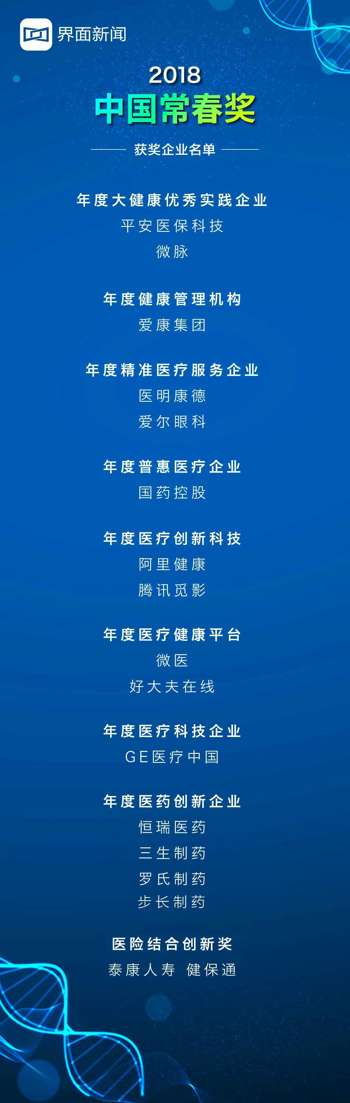 年度大健康優(yōu)秀實踐企業(yè)——平安醫(yī)??萍?、微脈;年度健康管理機構——愛康集團;年度精準醫(yī)療服務企業(yè)——醫(yī)明康德、愛爾眼科;年度普惠醫(yī)療企業(yè)——國藥控股;年度醫(yī)療創(chuàng)新科技——阿里健康、騰訊覓影;年度醫(yī)療健康平臺——微醫(yī)、好大夫在線;年度醫(yī)療科技企業(yè)——GE醫(yī)療中國;年度醫(yī)藥創(chuàng)新企業(yè)——恒瑞醫(yī)藥、三生制藥、羅氏制藥、步長制藥;醫(yī)險結合創(chuàng)新獎——泰康人壽 健保通。