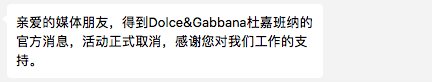 下午5點左右,Dolce & Gabbana官方微信發(fā)布了新的聲明,稱大秀是“改期”而非取消。