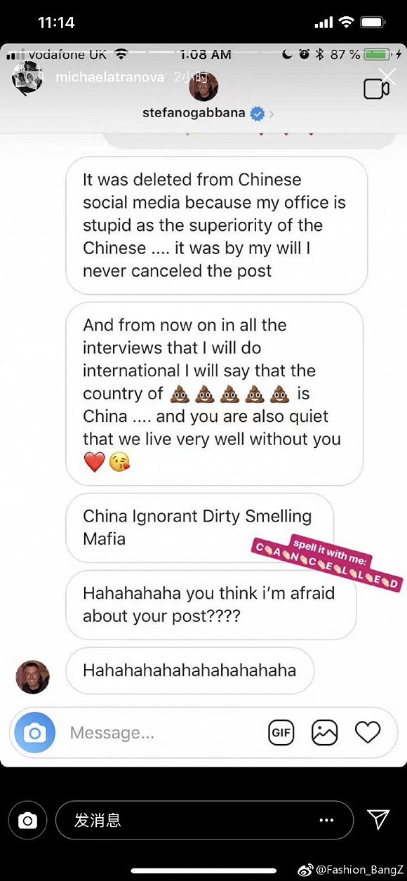 這一切都源自創(chuàng)始人兼設(shè)計師Stefano Gabbana和網(wǎng)友被曝光的幾則辱華聊天記錄,導致這場秀從萬眾期待到被取消,從造勢憋勁兒到付諸東流,不過經(jīng)歷了還不到24個小時。