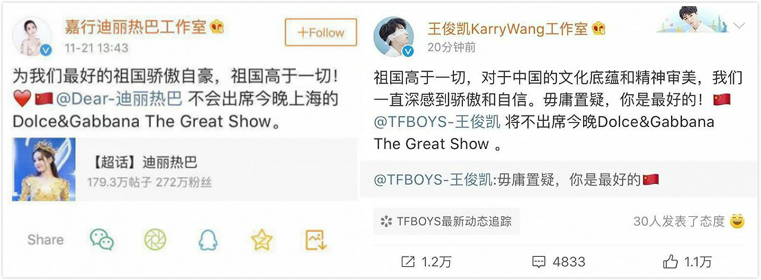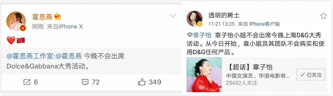 中午12點,受邀走秀的中國明星李振洋在微博發(fā)布聲明,稱拒絕出席,并表達了愛國的態(tài)度。大約在下午1點左右,王俊凱、迪麗熱巴、章子怡、陳坤、火箭少女、金大川、霍思燕等明星紛紛發(fā)微博表示不會參加今晚大秀。章子怡還說,她本人和團隊不會再購買和使用任何Dolce & Gabbana的產(chǎn)品。連共青團中央的官方微博也發(fā)了話,稱其“自取其辱”。