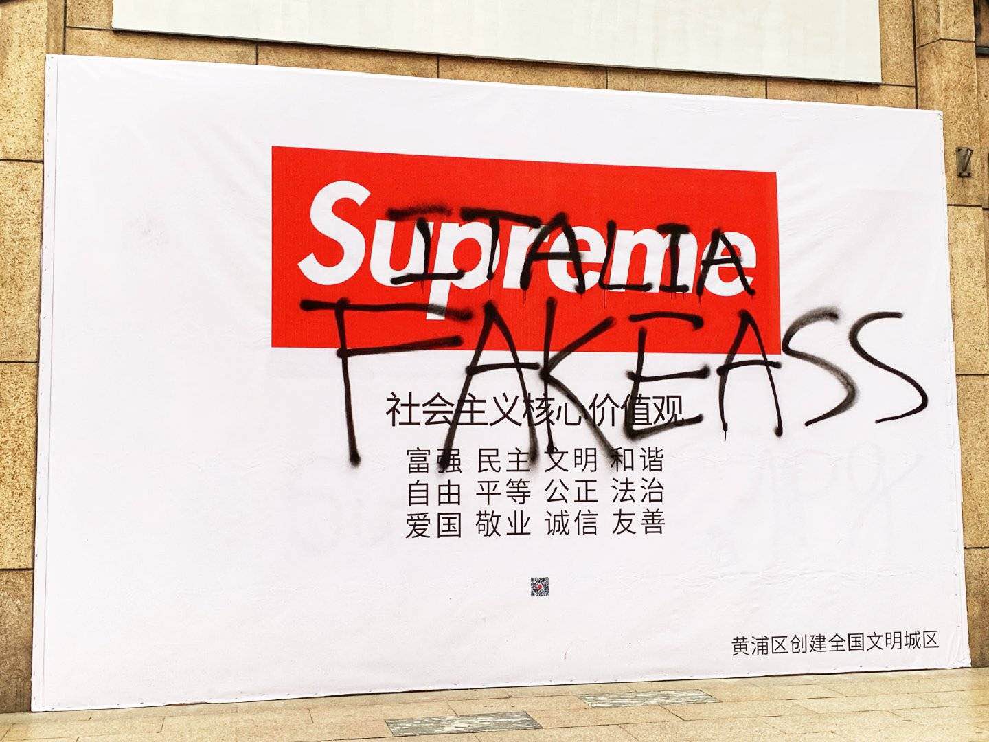 Supreme Italia的上海實體店目前已在建設(shè)中,不過很是被支持正牌Supreme的粉絲厭棄。有的裝修圍擋上甚至被人噴上了“Italia Fakeass(意大利假貨)”的涂鴉,為了反擊這樣的行為,Supreme Italia還在圍擋上印上了社會主義核心價值觀。