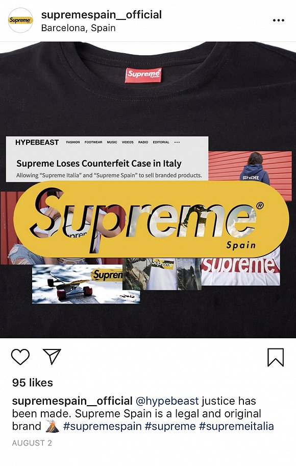 2016年,Supreme曾把Supreme Italia告到米蘭法院,法院在終審判決中裁決后者為不正當(dāng)競爭,要求下架12萬件商品,并對Supreme進(jìn)行經(jīng)濟(jì)賠償。Supreme Italia的官網(wǎng)因此被關(guān)閉,一切品牌宣傳活動后來都由Supreme Spain(西班牙Supreme)的官網(wǎng)及官方社交賬號代勞。
