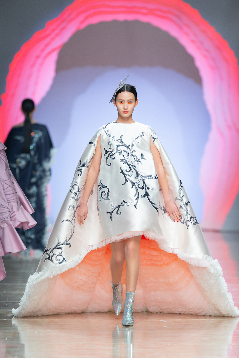 在這場秀的最后,嫵WOO 還展示了名為“鳳舞鸞笙”的斗篷作為壓軸。該斗篷設(shè)計(jì)靈感來源于鳳凰重生,款式前短后長,采用手工釘珠的精湛工藝,以漸變色彩表現(xiàn)鳳凰重生后的根根尾羽。