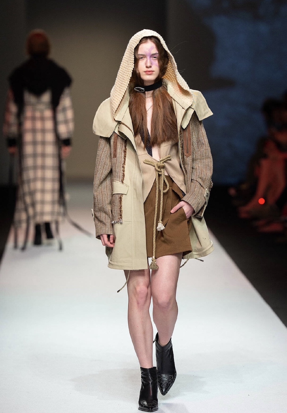 在追劇時,我們是什么樣的?于惋寧將她所看到的變成了服裝,將棉被披在身上,圍兜置于頸上。都市劇、科幻劇、古裝劇等元素的細(xì)節(jié)悉數(shù)登場。一片式的裙子,讓人想起古代的裙裾;PVC吊環(huán)點(diǎn)綴的棉外套,又仿佛進(jìn)入了未來世紀(jì)的世界里。