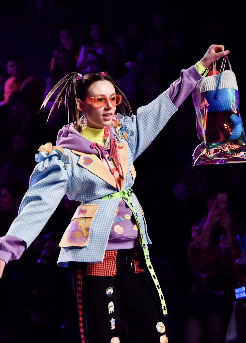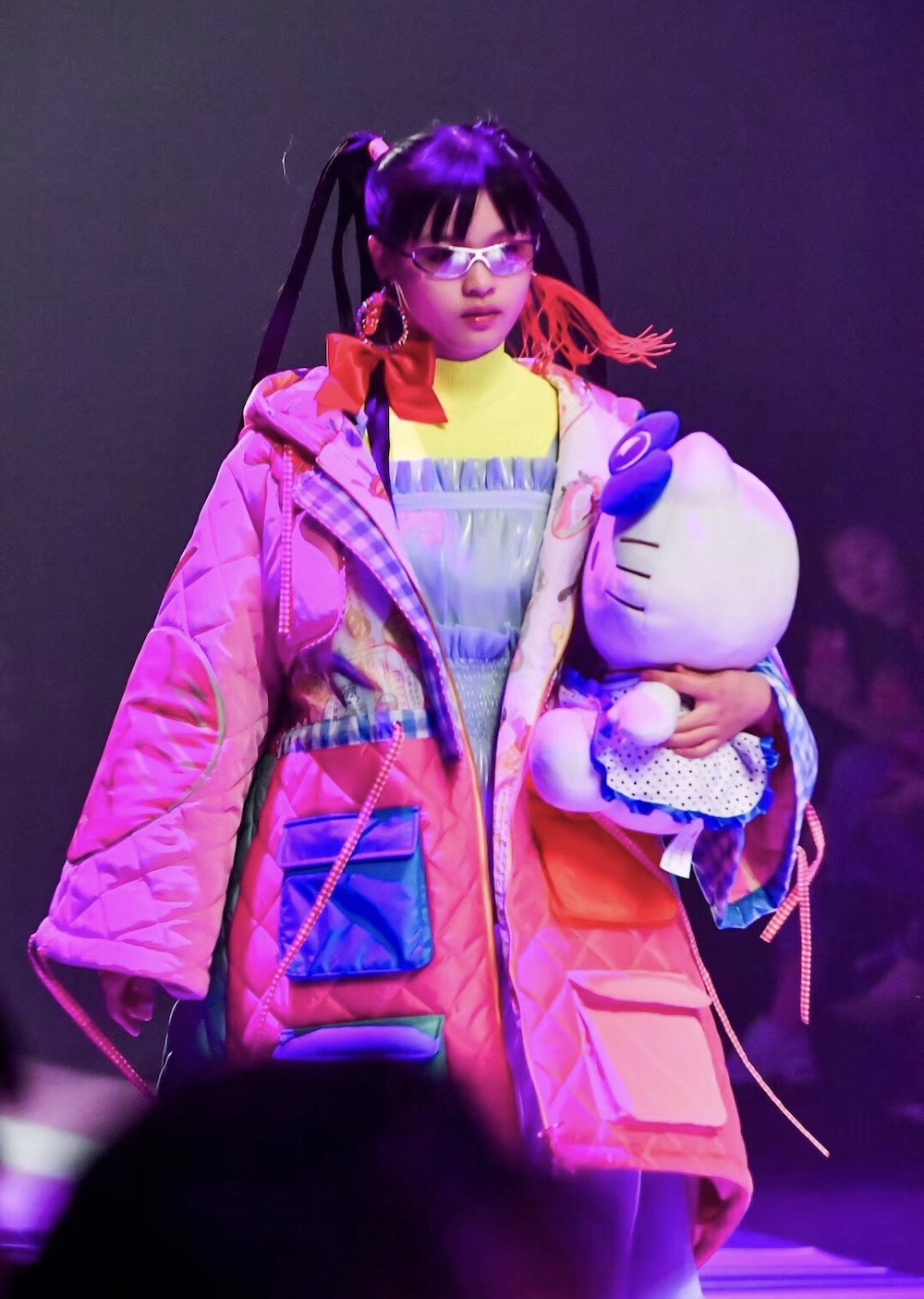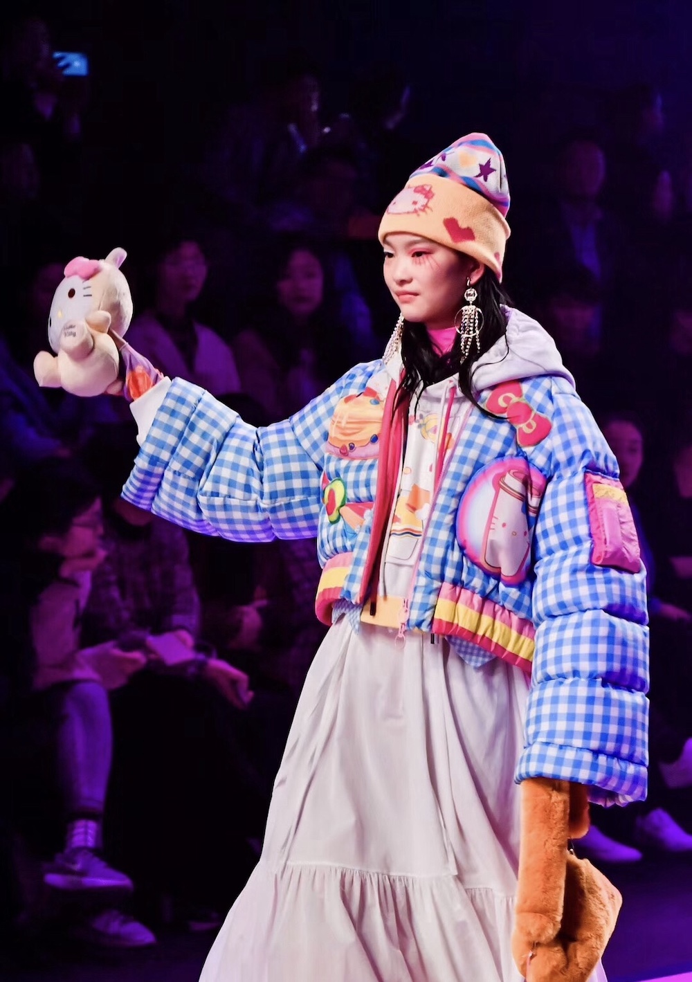 本季Leaf Xia的用色比以往更加大膽,在保持配色豐富多彩的同時,使用充滿趣味的印花拼接,視覺沖擊極強(qiáng),張揚(yáng)又充滿活力。此外,Leaf Xia還聯(lián)名Hello Kitty設(shè)計(jì)了一個系列。這個系列配色以明黃,嫩粉和水藍(lán)色為主,搭配用彩帶裝飾的高馬尾造型和hello kitty系列玩偶,視覺上更加減齡。在設(shè)計(jì)方面,為了一改羽絨衣設(shè)計(jì)普遍較為臃腫,色彩普遍較為沉悶的刻板印象,Leaf Xia改用色彩艷麗的印花,試圖為冬日增添一抹亮色。
