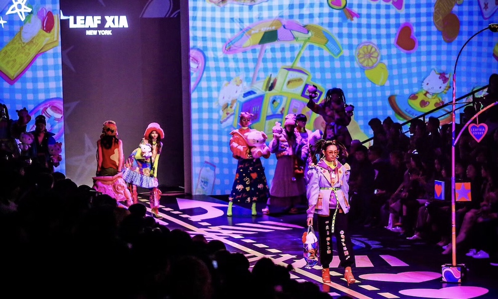 七年求學(xué)出道于紐約,三年成長扎根在上海,Leaf Xia試圖在這場秀里講述個體關(guān)于追夢的故事。大秀以投影在大屏幕上的上海地鐵緩緩駛?cè)氍F(xiàn)場開場,配合極具辨識度的紐約地鐵報站聲,仿佛把觀眾拉入紐約唐人街的現(xiàn)場。