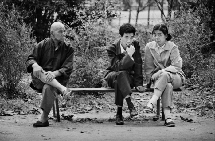 1978年,上海人民公園內(nèi),一對年輕男女并排坐在一張公園長凳上。他們之間沒有肢體接觸,但兩人相向蹺著二郎腿的動作和微微向?qū)Ψ絻A斜的姿勢流露出彼此的親密。在長凳另一端坐著的老人嚴肅地盯著他們,眼神中流露出不認同。