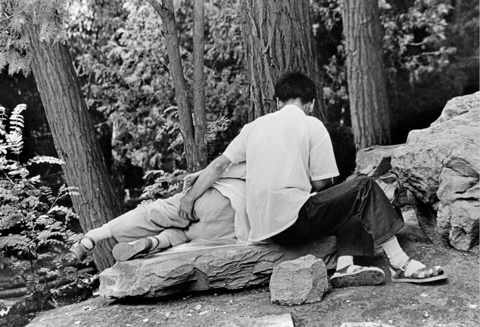 劉香成注意到人們開始小心又雀躍地嘗試在公共場所出雙入對,談情說愛。1978年,他在上海人民公園拍到了一對在老人嚴肅注視下坐在長凳上聊天的情侶。1979年,他在北京動物園游人如織的馬路旁拍到了一對背過身去談戀愛的青年男女。“早些年,人們在公共場合還是比較害羞的,即使是你們在公園里坐得比較近,也會被人怒目而視,因為人和人之間距離過近被認為不符合規(guī)矩。”史密斯告訴界面文化(ID:BooksAndFun),劉香成在當時發(fā)現(xiàn)了一個有趣的現(xiàn)象,人們會在公園里大排長隊,只為了有機會能坐下來“談戀愛”,“光一起散散步可不行,意義可不如在公園里一起坐下來。”