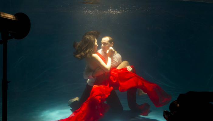 2016年,同樣在上海,一對跨國情侶在摩托車上起了爭執(zhí)。“我想拍個水下婚紗照,”來自烏魯木齊的Jenny說,“你知道吧,然后我們可以……”“我不要。”來自澳大利亞的David打斷她。但男生還是向女生妥協(xié)了。女生穿著一條火紅的長裙,在男生的懷里溫柔凝視對方。兩人潛入一個巨大的水缸,女生的發(fā)絲和裙擺在水波中飄蕩開來。站在水缸外的攝影師迅速按下快門。