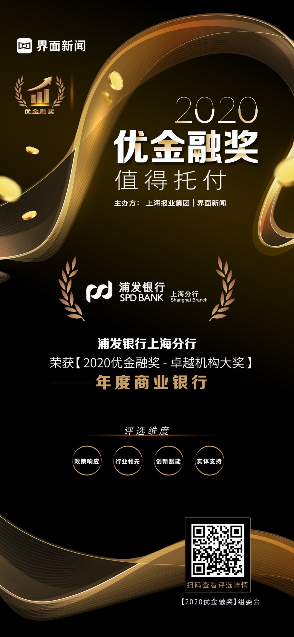 12月23日,上海報(bào)業(yè)集團(tuán)l界面新聞在在上海靜安瑞吉酒店舉辦了【2020優(yōu)金融獎(jiǎng)】頒獎(jiǎng)典禮,并正式公布了本年度獲獎(jiǎng)名單。在這項(xiàng)萬(wàn)眾期待的金融業(yè)年度評(píng)選中,來(lái)自銀行、保險(xiǎn)、證券、基金、信托、期貨、投資、財(cái)管、金融科技的38家金融機(jī)構(gòu)與企業(yè),憑借年度市場(chǎng)表現(xiàn)與行業(yè)影響力,獲得年度大獎(jiǎng)。其中,浦發(fā)銀行上海分行憑借其在行業(yè)內(nèi)的優(yōu)異表現(xiàn),榮膺卓越機(jī)構(gòu)大獎(jiǎng)——年度商業(yè)銀行。