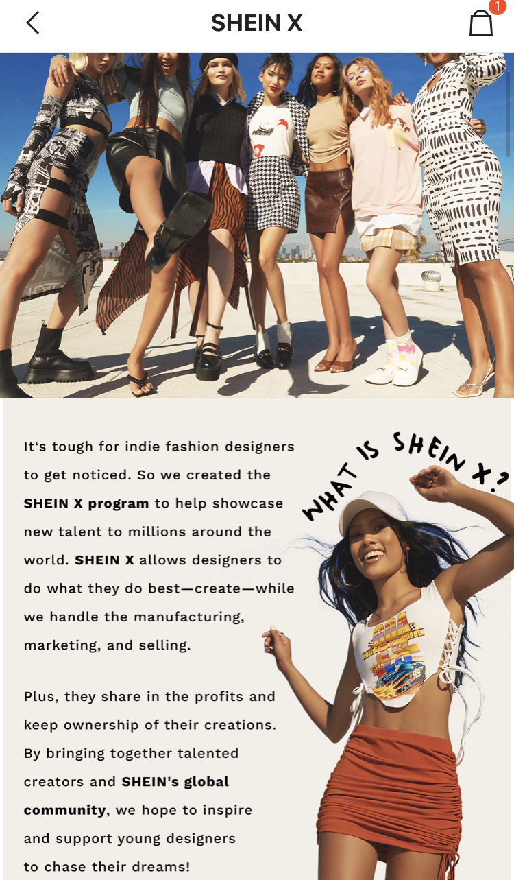 而從2021年1月開始,SHEIN啟動了一項全新的設計師聯(lián)名計劃“Shein X”,該計劃旨在與全球年輕設計師和藝術家合作,推出為期不少于三個月的限時聯(lián)名系列商品,該計劃全年向外界開放申請。