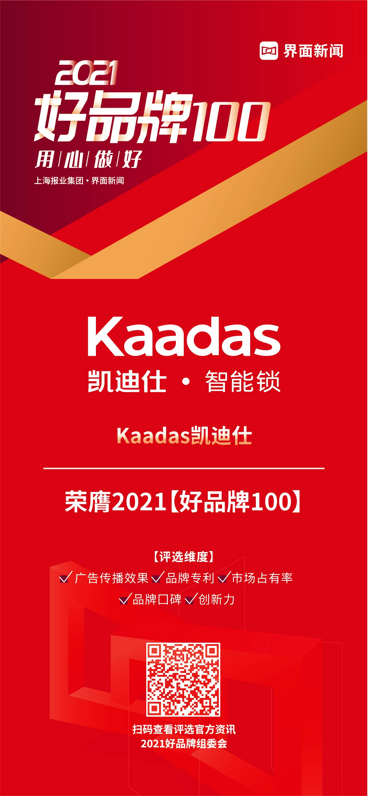 Kaadas凱迪仕專注于智能鎖領(lǐng)域,是一家集產(chǎn)品研發(fā)、制造、銷售、安裝、售后于一體的全產(chǎn)業(yè)鏈公司,是國(guó)家高新技術(shù)企業(yè),總部位于中國(guó)深圳,以服務(wù)全球每一個(gè)家庭作為愿景,堅(jiān)持以科技的點(diǎn)滴進(jìn)步,讓人們的生活更美好,以安全、便捷、智能的產(chǎn)品,為萬(wàn)千家庭帶來(lái)高品質(zhì)生活體驗(yàn),讓科技的光芒溫暖每一個(gè)人的內(nèi)心。此次,凱迪仕作為智能門鎖行業(yè)唯一的獲獎(jiǎng)品牌,榮登2021【好品牌100】主榜。