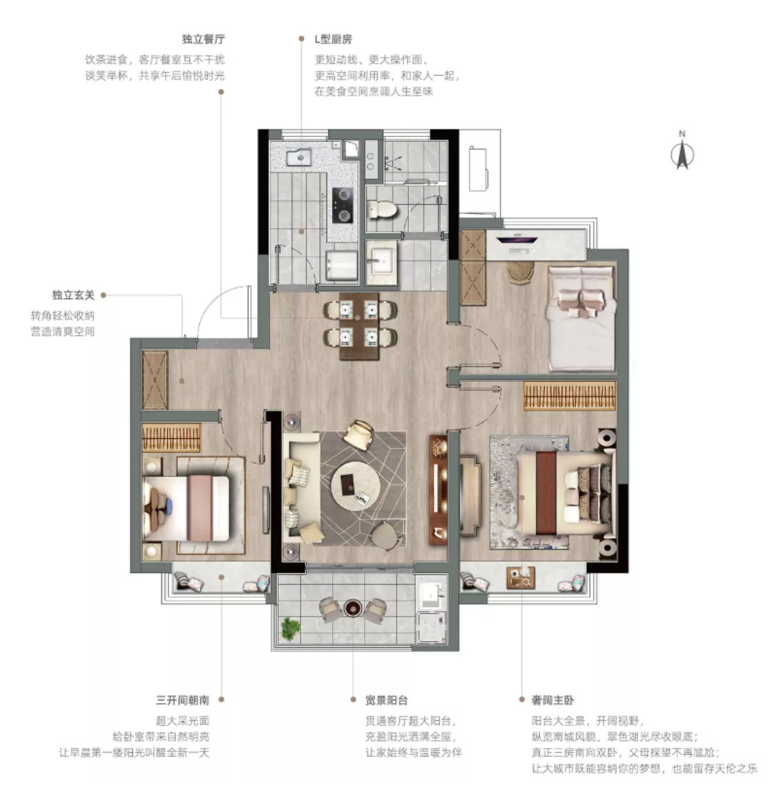 本次加推的為建面約78㎡戶型為三室二廳一衛(wèi)設(shè)計,三開間朝南,保證采光,L型廚房,符合人體操作動線,衛(wèi)生間干濕分離,方便后期打掃。