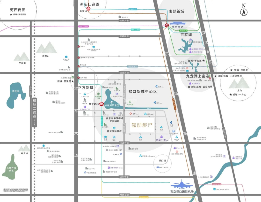 銀城藍湖郡位于祿口新城核心居住區(qū),臨近如意湖周邊各類生活配套豐富。商業(yè)上距離祿口的百麗廣場、棉花糖廣場較近,此外翔宇路北站已確定引進海倫堡商業(yè)綜合體;醫(yī)療方面區(qū)域內(nèi)規(guī)劃了軌跡高標準的醫(yī)養(yǎng)綜合體用地;教育資源方面,新城核心區(qū)規(guī)劃了26所學校,含14所幼兒園、7所小學、5所中學,教育資源豐富。