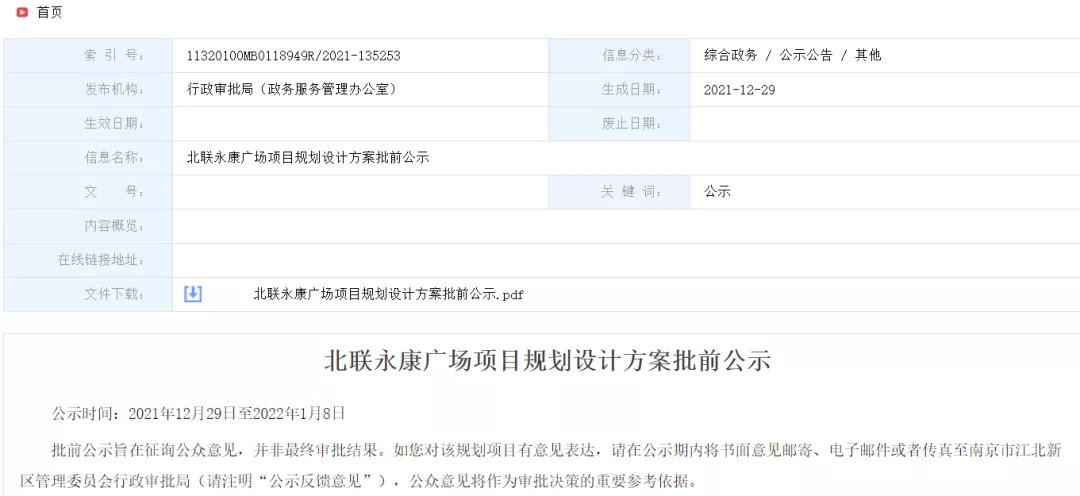 近日,江北新區(qū)官網(wǎng)公布了一則《北聯(lián)永康廣場項目規(guī)劃設(shè)計方案批前公示》。