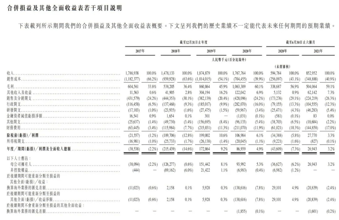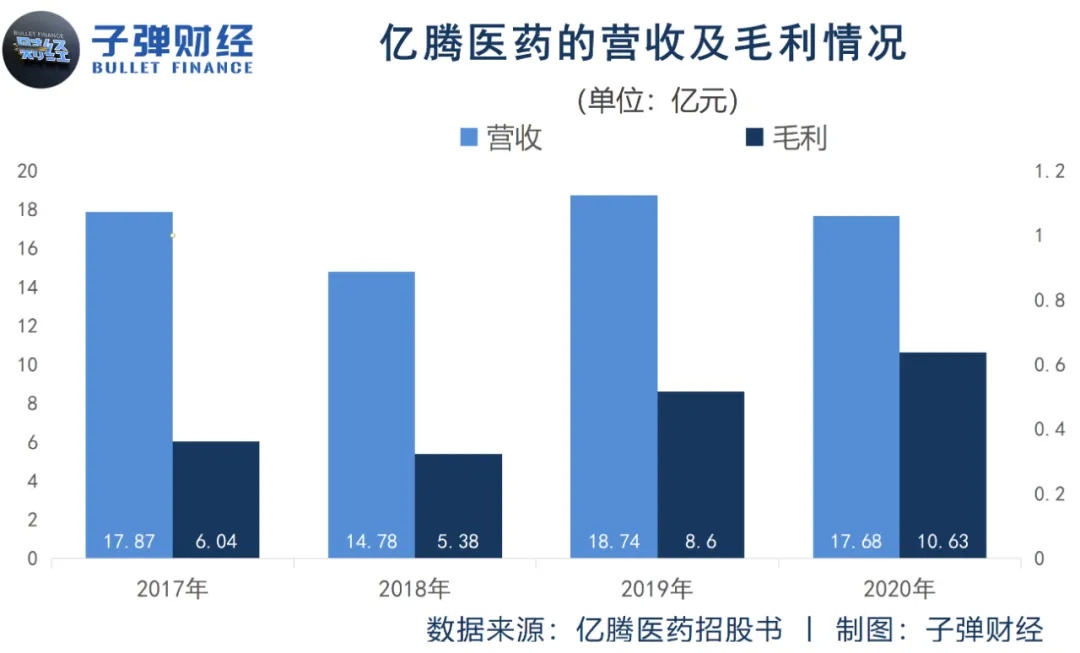 招股書顯示,億騰醫(yī)藥2017年、2018年、2019年、2020年營收分別為17.87億元、14.78億元、18.74億元、17.68億元;毛利分別為6.04億元、5.38億元、8.6億元、10.63億元。