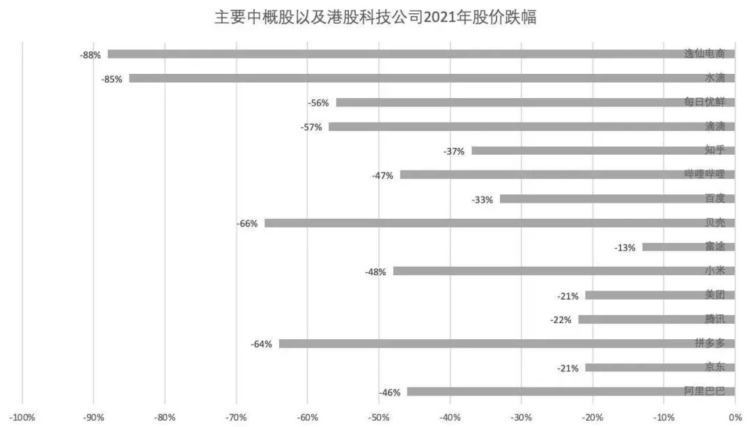 36kr統(tǒng)計(jì)的數(shù)據(jù)顯示,截止2021年12月末,代表中概股指數(shù)表現(xiàn)的中概ETF已經(jīng)從2021年初的85.6美金,跌至40美金,直接腰斬。事實(shí)上,從單個(gè)巨頭的股票走勢(shì),我們更能看到這種趨勢(shì)——2021年以來(lái),阿里巴巴股價(jià)下跌了46%,拼多多股價(jià)下跌了64%,滴滴股價(jià)下跌了57%。