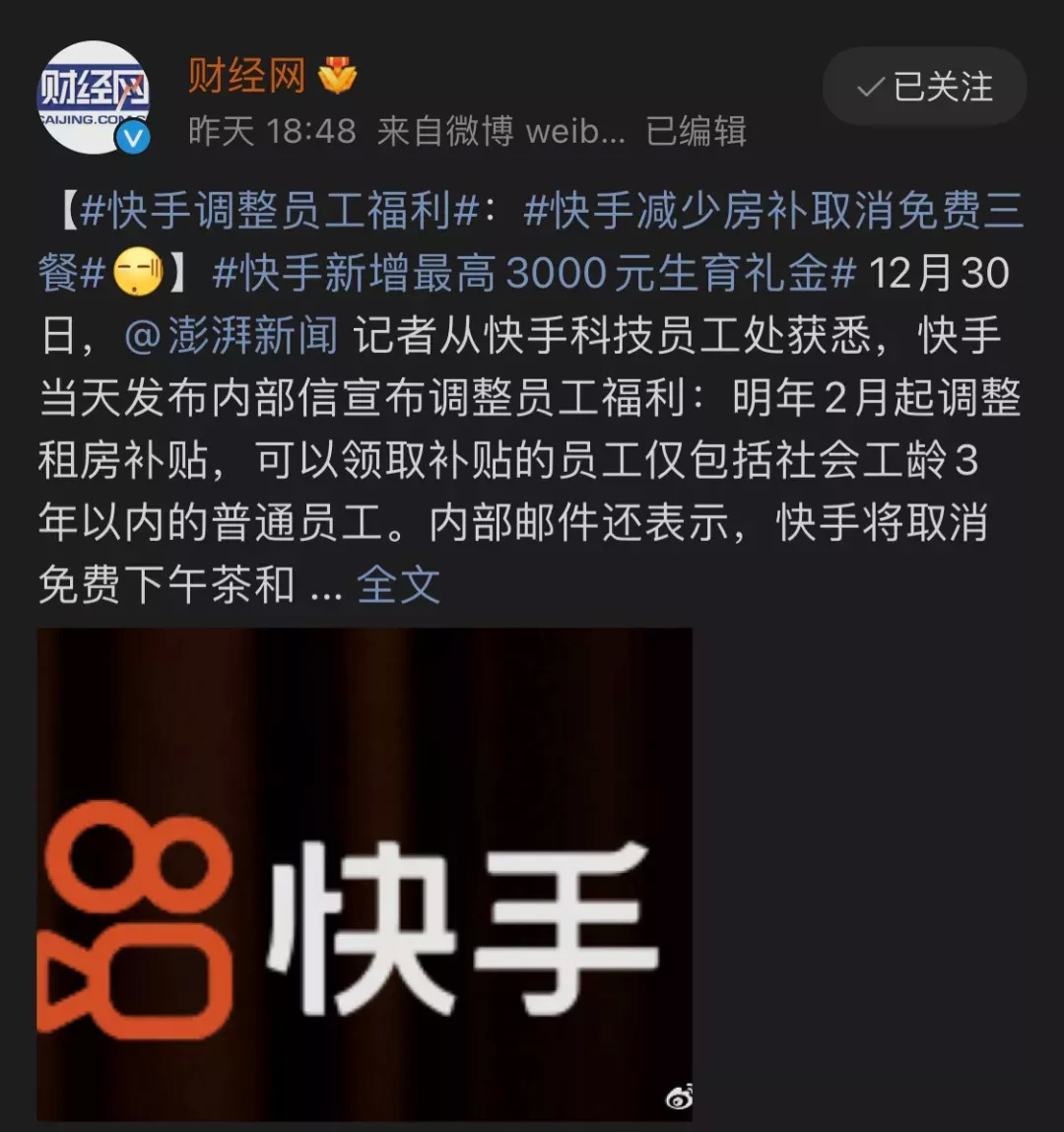 2021年12月初,有脈脈網(wǎng)友爆料稱(chēng),快手裁員30%,國(guó)際業(yè)務(wù)裁員30%已開(kāi)始。甚至到了12月末,快手還進(jìn)一步向員工的租房補(bǔ)貼、餐標(biāo)下手:自2022年2月起,將調(diào)整租房補(bǔ)貼,僅限于社會(huì)工齡3年以內(nèi)的普通員工可以領(lǐng)取,并且取消免費(fèi)下午茶和免費(fèi)三餐。