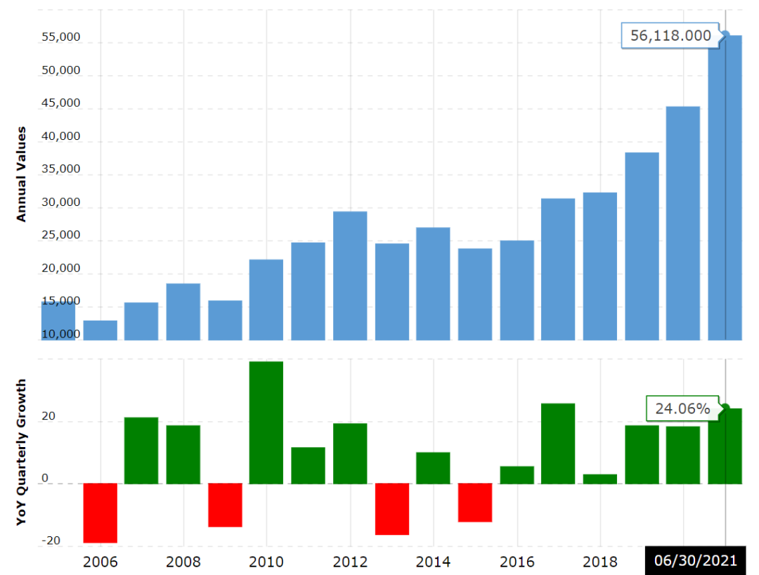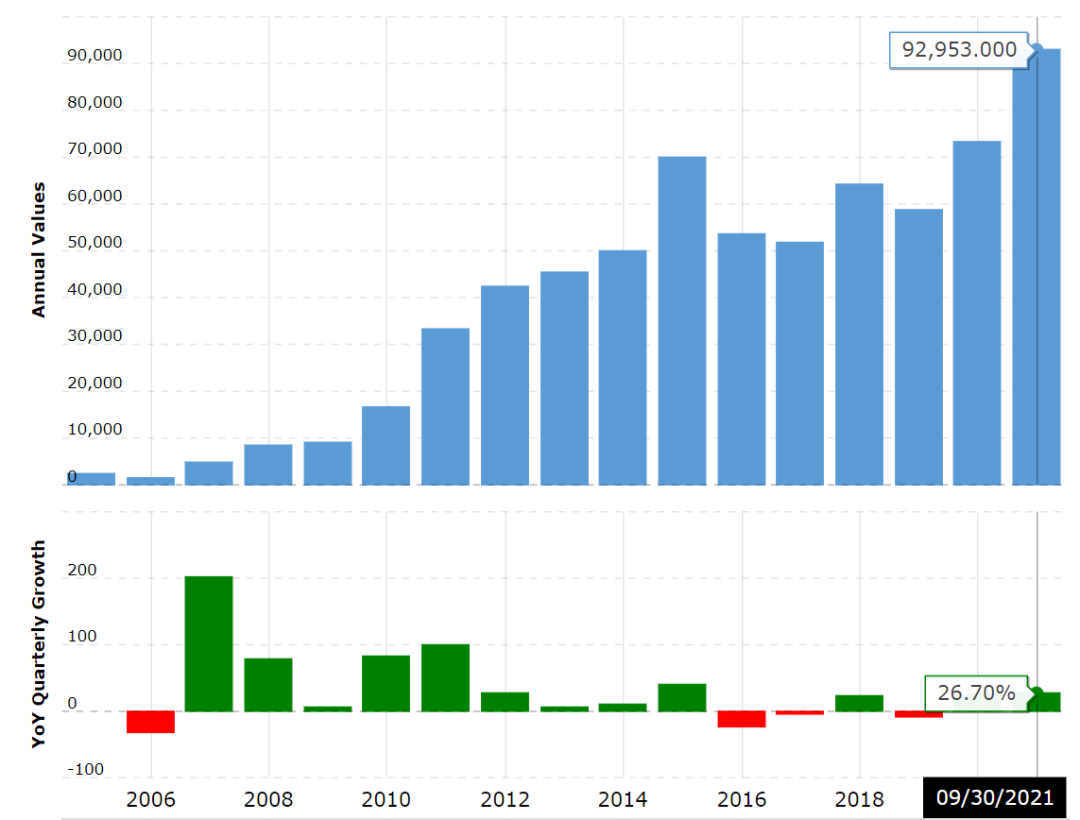 ▲2005-2021年9月30日,蘋(píng)果現(xiàn)金流統(tǒng)計(jì),單位:百萬(wàn)美元,來(lái)源:macrotrends