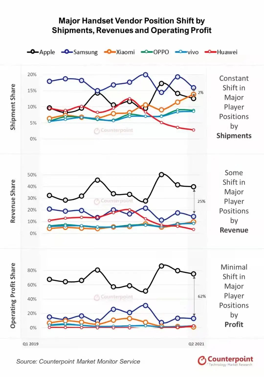 根據(jù)Counterpoint數(shù)據(jù),2021年第二季度,蘋(píng)果一家就拿走了全球智能手機(jī)行業(yè)整體營(yíng)收的四成,而利潤(rùn)更是拿走了四分之三,所有競(jìng)爭(zhēng)對(duì)手爭(zhēng)奪剩下的四分之一。這樣懸殊的差距也造就了蘋(píng)果不可復(fù)制的高利潤(rùn)。