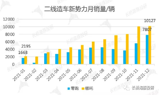 二線造車新勢力的崛起也是2021年車市的重要特征,以零跑、哪吒為例: