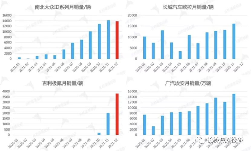 四個樣本車企的月銷量整體呈現(xiàn)攀升的趨勢,其中南北大眾ID系列、長城歐拉、廣汽埃安月銷量基本穩(wěn)定在1萬-1.5萬輛之間;