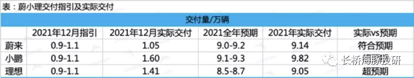 按照蔚小理11月時候給出的四季度銷量展望來倒推,三個公司12月份的交付數(shù)據(jù)均在0.9-1.1萬輛左右。實際交付數(shù)據(jù)只有蔚來落在預期之內(nèi),而小鵬和理想均大幅超出預期。