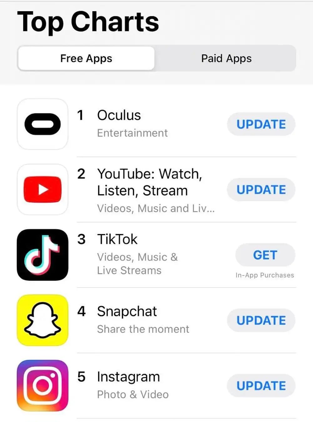 12月25日,Oculus App登頂了美國區(qū)蘋果App Store和Google Play商店的免費(fèi)下載榜,打敗了TikTok、Instagram、YouTube等社交軟件。