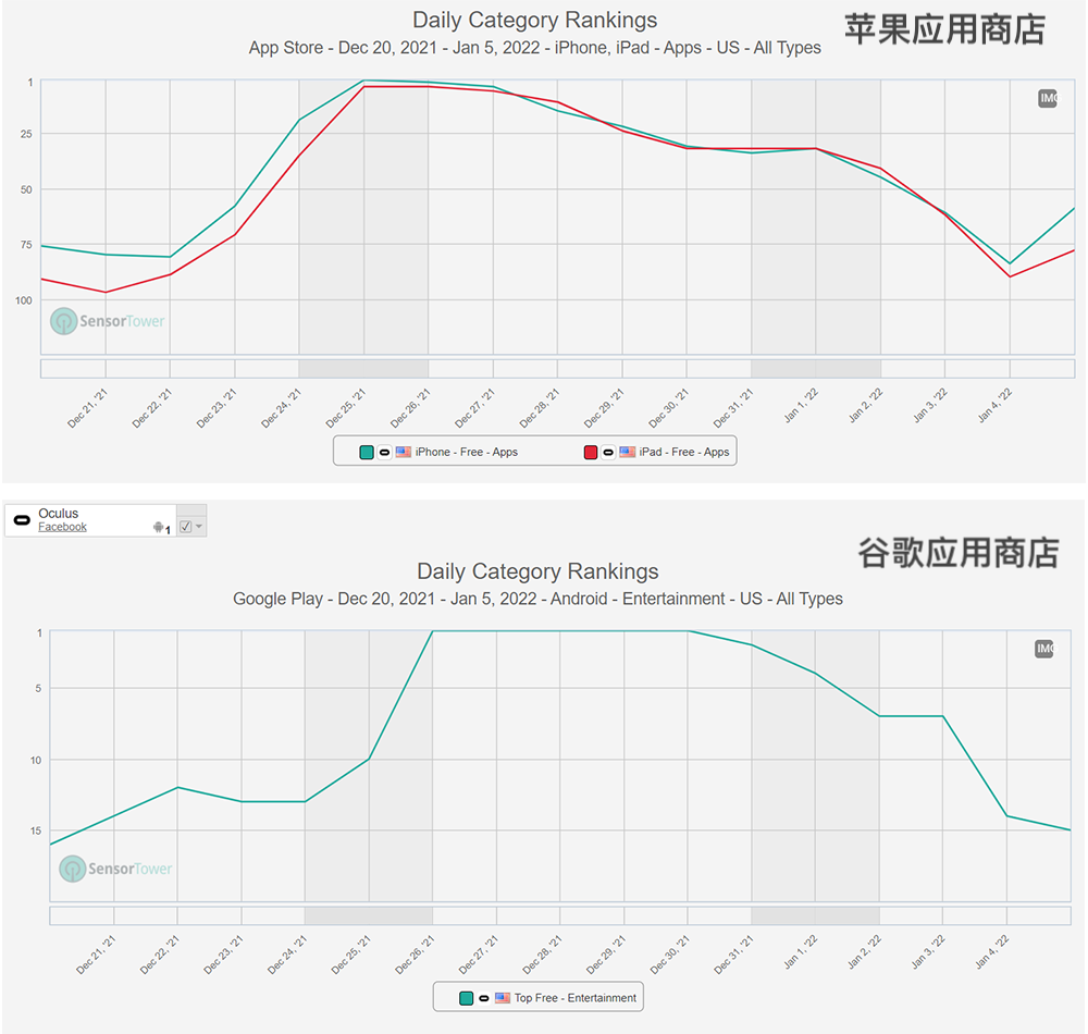 ▲12月20日-1月5日,Oculus在蘋果應(yīng)用商店(上)和谷歌應(yīng)用商店(下)的排名 來源:Sensor Tower