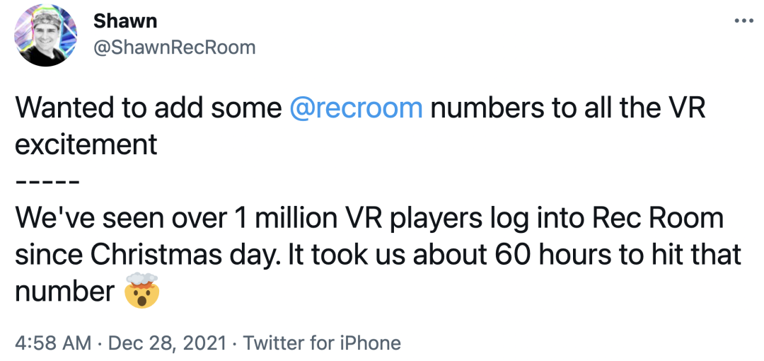 VR社交平臺(tái)Rec Room宣布,在圣誕期間,60小時(shí)內(nèi)有超過100萬名VR玩家登錄自家平臺(tái)。