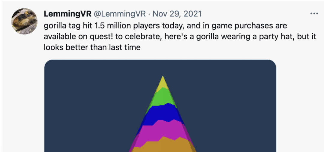 VR游戲《Gorilla Tag》的開發(fā)商Lemming VR也表示圣誕期間的玩家數(shù)量激增,在圣誕節(jié)期間,有34.4萬名用戶登陸軟件,而之前最多只有2.6萬,實(shí)現(xiàn)了近15倍的用戶增長。
