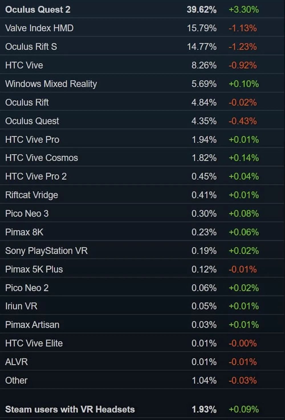 據(jù)美國科技媒體Road to VR報(bào)道,在連接Steam的VR設(shè)備中,Oculus Quest 2占據(jù)39.62%,遠(yuǎn)超過Valve Index的15.79%和HTC Vive的8.26%。從這些數(shù)據(jù)中,我們看到,至少在美國消費(fèi)級VR頭顯里,Oculus Quest 2的地位暫時(shí)無人能撼動(dòng)。