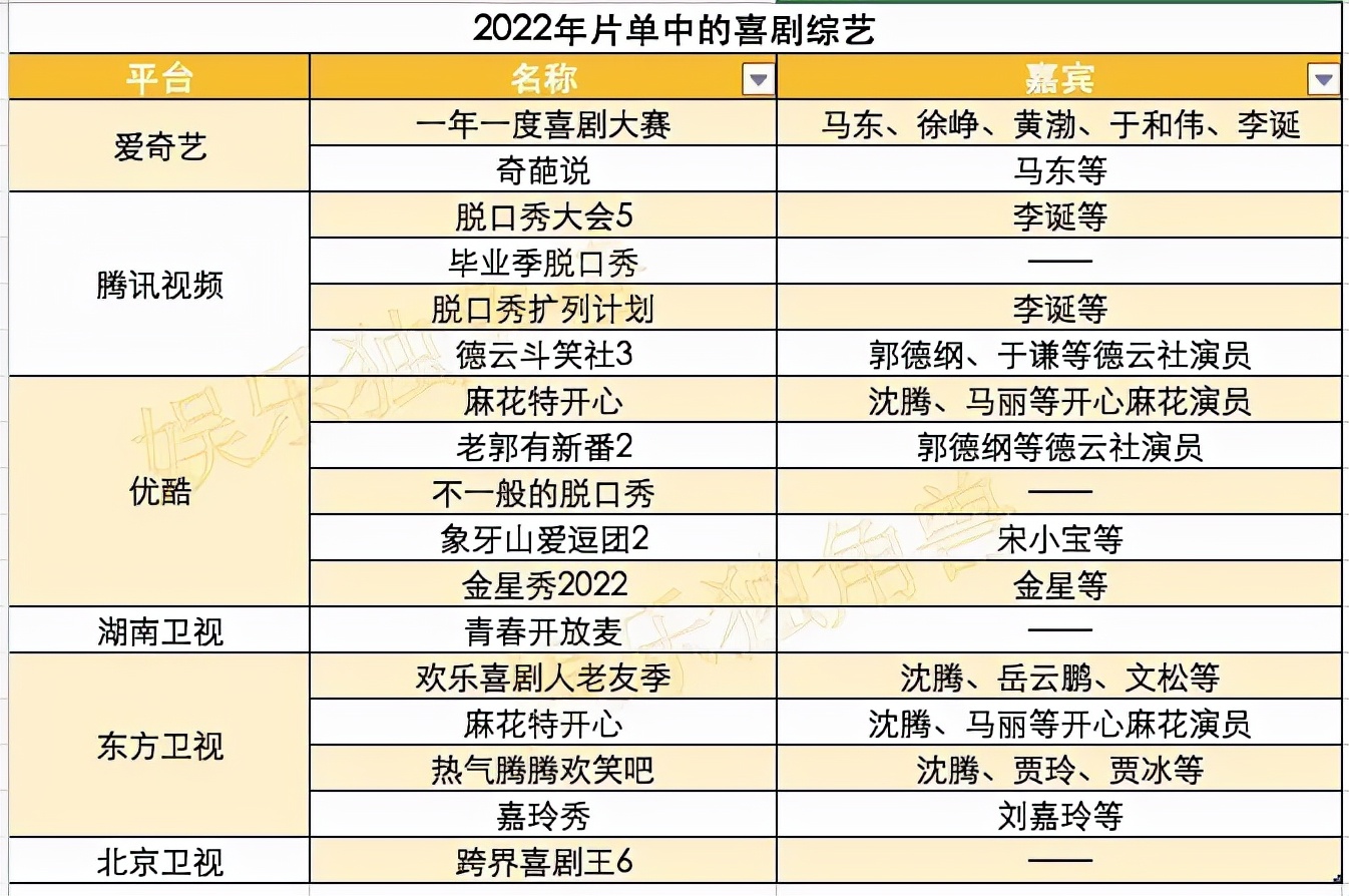 而經(jīng)歷了2020和2021年的黑馬突圍,2022年或許可以視作喜劇綜藝的裂變之年。從片單來看,視頻平臺和各大衛(wèi)視計劃中的頭部喜劇綜藝將達到16檔之多。