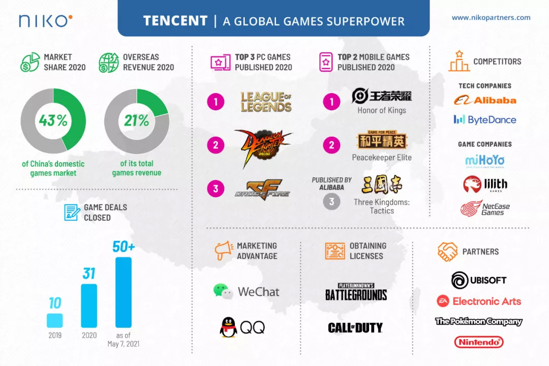 展開來看:今年前5個(gè)月騰訊共收購和投資了51家游戲公司,超過2020年31家的總和,是2019年投資收購游戲公司數(shù)量的5倍,折合每2.5天將一家游戲公司計(jì)入麾下。