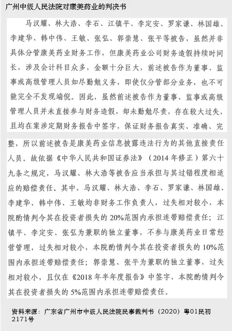2021年11月12日,廣州中級人民法院對康美藥業(yè)作出一審判決:責(zé)令康美藥業(yè)股份有限公司因年報等虛假陳述侵權(quán)賠償證券投資者損失24.59億元,原董事長、總經(jīng)理馬興田及5名直接責(zé)任人員、正中珠江會計師事務(wù)所及直接責(zé)任人員承擔(dān)全部連帶賠償責(zé)任,13名相關(guān)責(zé)任人員按過錯程度分別承擔(dān)20%、10%、5%的部分連帶賠償責(zé)任。