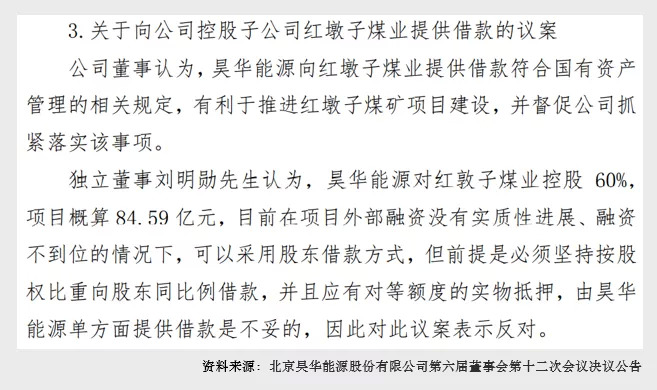 如12月23日昊華能源發(fā)布的公告,公司召開第六屆董事會第十二次會議審議通過了《關(guān)于向公司控股子公司紅墩子煤業(yè)提供借款的議案》,該議案的表決結(jié)果為:同意11票、反對1票、棄權(quán)0票。反對票由獨(dú)董劉明勛投出。