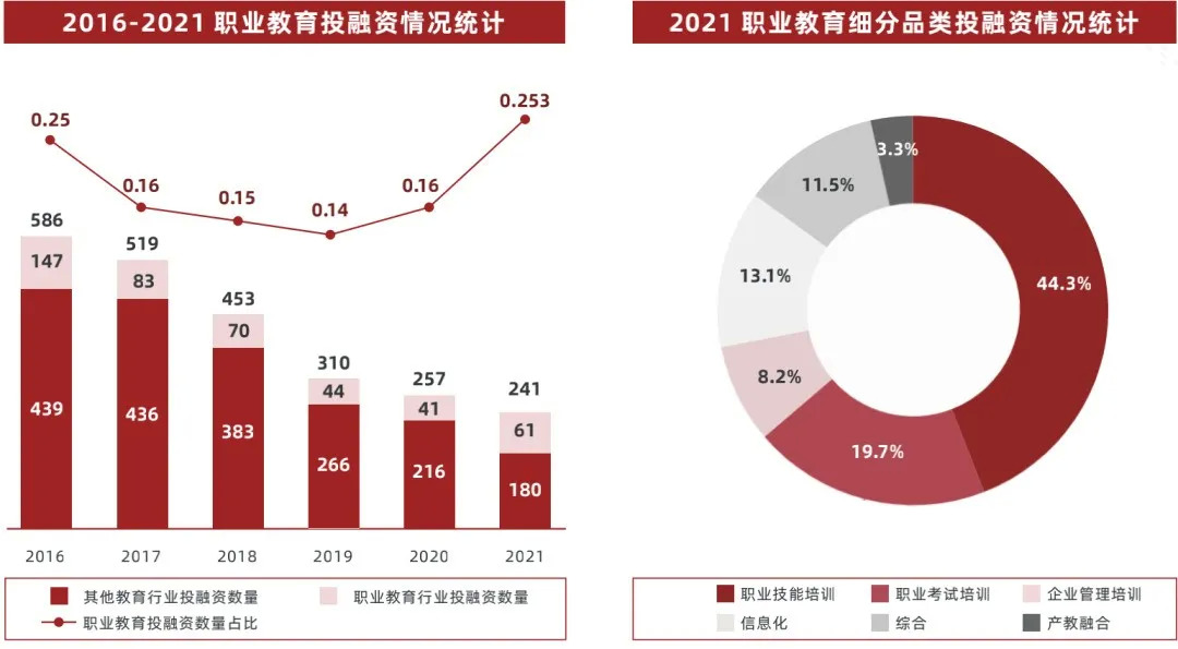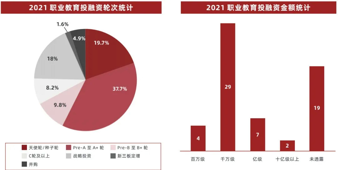 根據(jù)《2022 中國(guó)職業(yè)教育行業(yè)報(bào)告》,2021 年,職業(yè)教育一級(jí)市場(chǎng)共發(fā)生 61 筆融資,融資總金額超過(guò) 78 億元人民幣,融資數(shù)量與總金額均超過(guò) 2020 年;同時(shí),投融資數(shù)量在整個(gè)教育行業(yè)中的占比,也達(dá)到近 5 年來(lái)的新高。