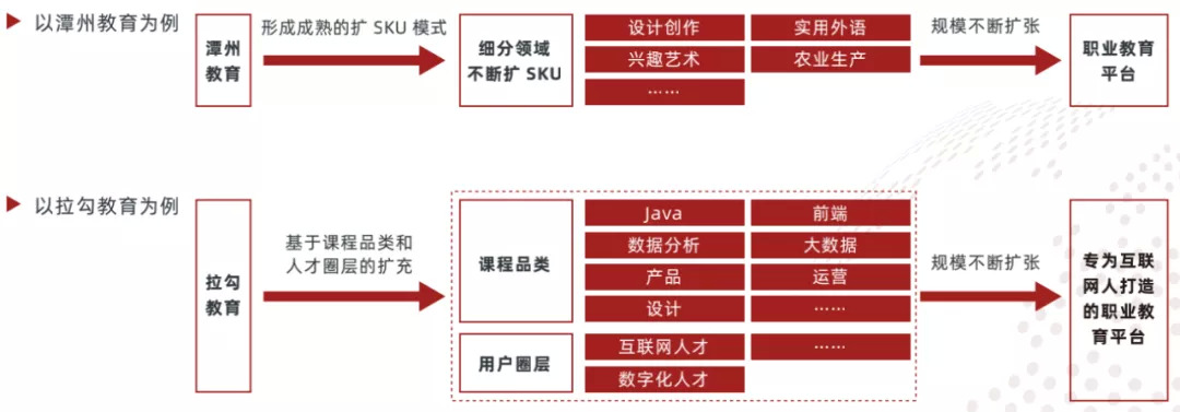 目前,職業(yè)教育行業(yè)龍頭在縱向延伸上,已經(jīng)探索出「招生+培訓(xùn)+就業(yè)+就業(yè)后」的商業(yè)閉環(huán);橫向延伸上則通過(guò)擴(kuò)張 SKU 以有效利用企業(yè)原有的運(yùn)營(yíng)、資金、成熟的商業(yè)模式等優(yōu)勢(shì)。此舉,可成為 K12 教培機(jī)構(gòu)轉(zhuǎn)型中的有益借鑒。