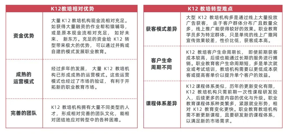 K12 教培機(jī)構(gòu)轉(zhuǎn)型的優(yōu)勢(shì)和難點(diǎn);數(shù)據(jù)來(lái)源:多鯨教育研究院整理