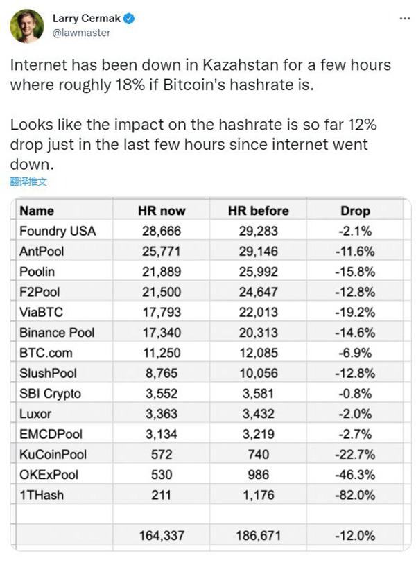 區(qū)塊鏈網(wǎng)站The Block的研究人員Larry Cermak在Twitter發(fā)文指出,6日當(dāng)天,哈薩克斯坦斷網(wǎng)后數(shù)小時(shí),比特幣哈希率下跌了12%。哈希率是比特幣網(wǎng)絡(luò)處理能力的度量單位,也稱(chēng)算力。哈希率越高,比特幣網(wǎng)絡(luò)就越安全。
