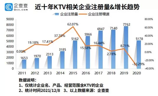 我國現(xiàn)存KTV相關(guān)企業(yè)5.63萬家。近兩年來,我國KTV相關(guān)企業(yè)注冊量不斷減少,2020年新增5178家,同比減少33.29%。
