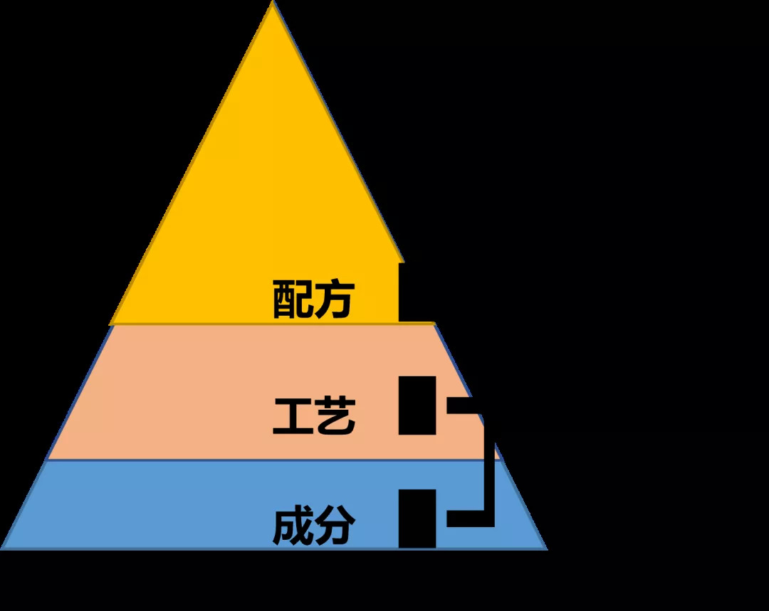 引用楊建中教授的圖,我們可以了解到產(chǎn)品是配方+制作工藝+原料的組合體,其中占據(jù)高位的便是配方,這是因為在產(chǎn)品使用同一成分與相同標(biāo)準(zhǔn)的制作工藝時,配方便成為產(chǎn)品差異化的重要砝碼。