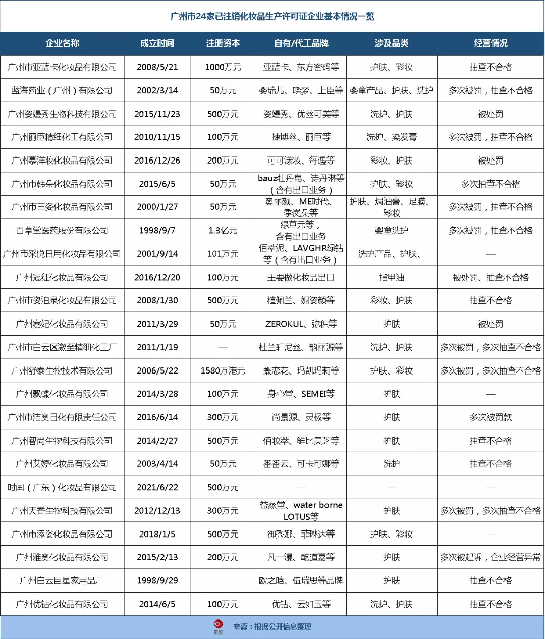 類似于廣州市白云區(qū)激至精細(xì)化工廠、廣州麗臣精細(xì)化工有限公司、廣州市三姿化妝品有限公司、廣州舒泰生物技術(shù)有限公司、廣州天香生物科技有限公司等公司也曾多次被罰,且多次抽查不合格。經(jīng)統(tǒng)計,這24家企業(yè)中,曾被抽查不合格的企業(yè)多達15家。