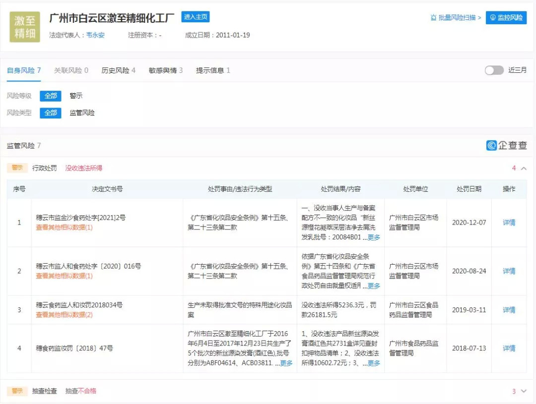 以廣州市白云區(qū)激至精細(xì)化工廠為例,企查查顯示,該公司分別在2018年7月、2019年3月、2020年8月和12月,因生產(chǎn)與許可批件配方不一致的產(chǎn)品、生產(chǎn)未取得批準(zhǔn)文號的特殊用途化妝品、生產(chǎn)與備案配方不一致的化妝品等原因被處以罰款,這4次罰款金額共計約為17.83萬元。不僅如此,該公司還分別在2018年、2019年和2020年被抽查不合格,被責(zé)令整改。