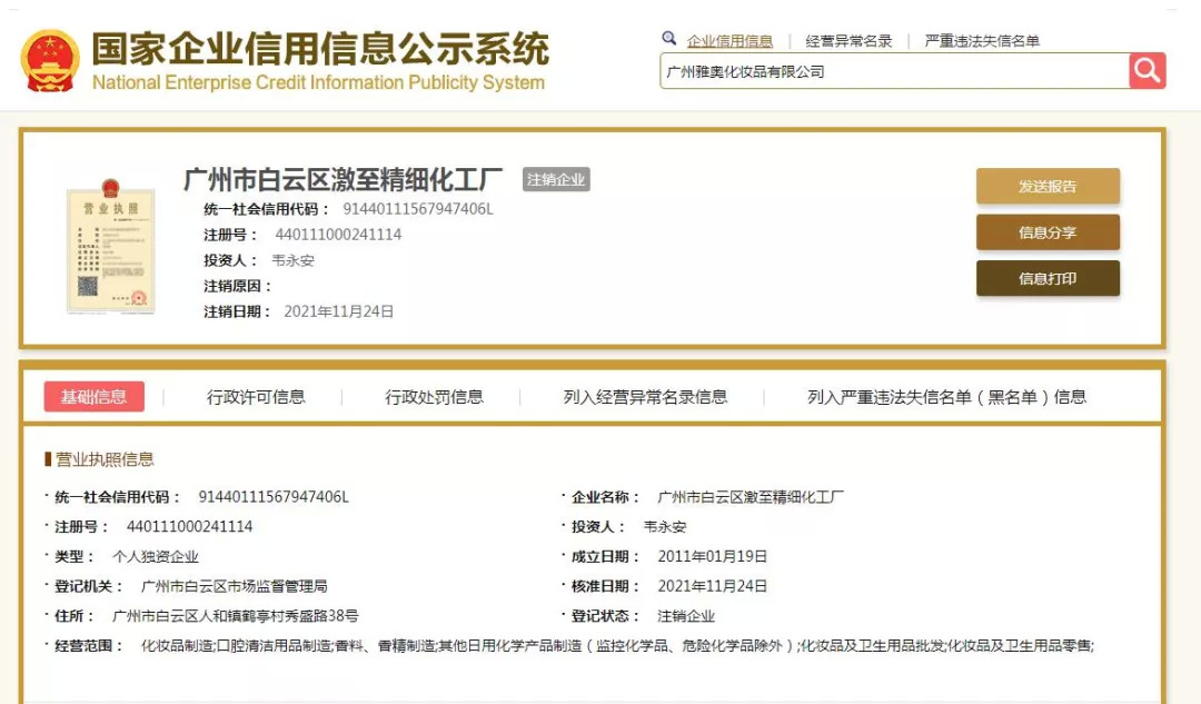 根據(jù)國家企業(yè)信用信息公司系統(tǒng)顯示,目前,廣州市白云區(qū)激至精細(xì)化工廠已顯示為“注銷企業(yè)”。