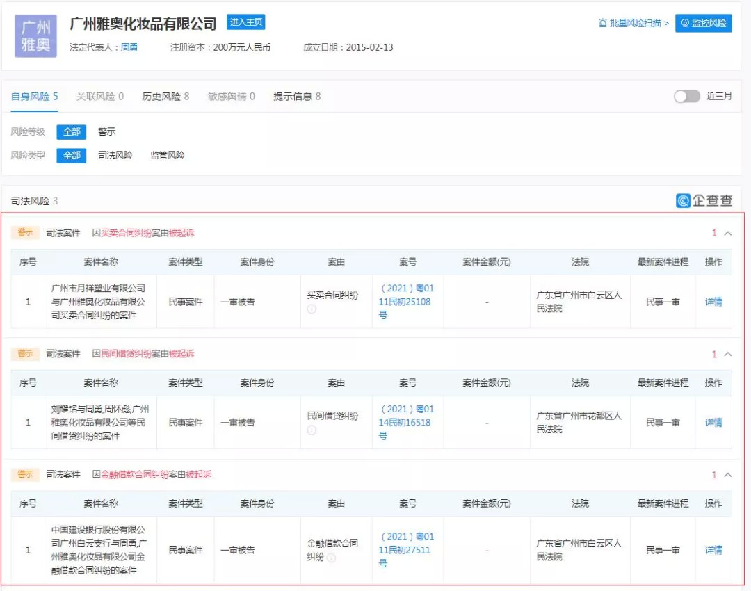 不僅如此,部分企業(yè)還存在著經(jīng)營異常的情況或是被多次起訴。如廣州雅奧化妝品有限公司,僅在去年一年就分別因金融借款合同糾紛、民間借貸糾紛、買賣合同糾紛等案由被多家公司和個人起訴,目前該企業(yè)已被列為“經(jīng)營異常名錄”。
