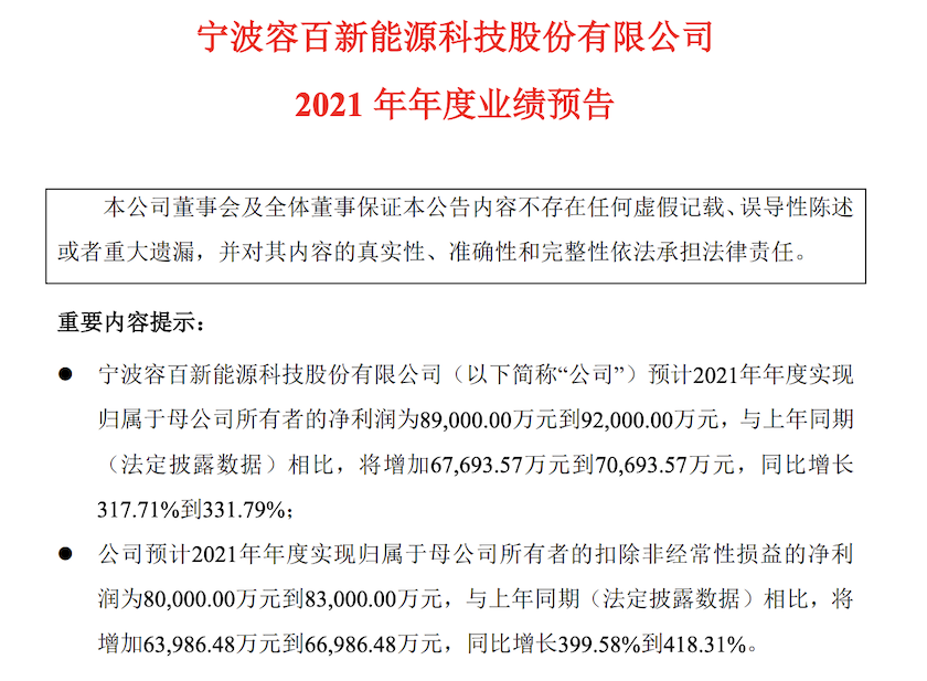 另外,根據(jù)容百科技近日的業(yè)績(jī)預(yù)告,2021年公司歸屬于母公司所有者的凈利潤(rùn)預(yù)計(jì)為8.9億元到9.2億元,同比增長(zhǎng)率達(dá)到了317.71%到331.79%。