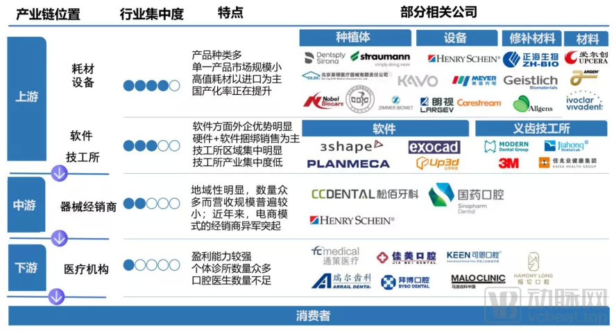 這需要從種植牙的產(chǎn)業(yè)鏈情況分析。具體來說,種植牙分為以設備和耗材企業(yè)為主的上游,以器械經(jīng)銷商為主的中游,以及以口腔醫(yī)療機構(gòu)為主的下游。