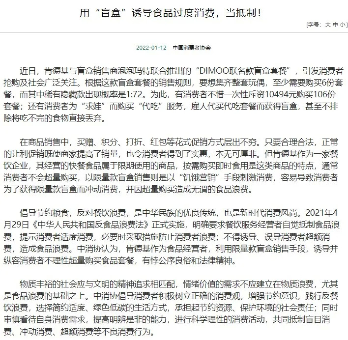 在這篇名為《用“盲盒”誘導(dǎo)食品過度消費(fèi),當(dāng)?shù)种?!》的文章中,提到了肯德基與泡泡瑪特聯(lián)合推出了“DIMOO聯(lián)名款盲盒套餐”,整套盲盒共7款,其中稀有款出現(xiàn)率1:72。為此,有消費(fèi)者不惜一次性斥資10494元購買106份套餐;還有消費(fèi)者為“求娃”而購買“代吃”服務(wù),雇人代買代吃套餐獲得盲盒,甚至不排除將吃不完的食物直接丟棄。中消協(xié)認(rèn)為,肯德基作為食品經(jīng)營者,利用限量款盲盒銷售手段,誘導(dǎo)并縱容消費(fèi)者不理性超量購買食品套餐,有悖公序良俗和法律精神。