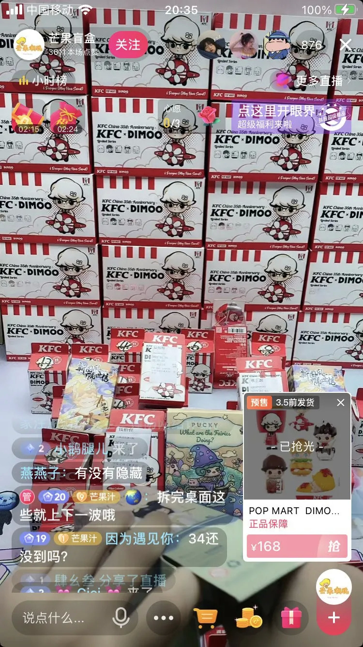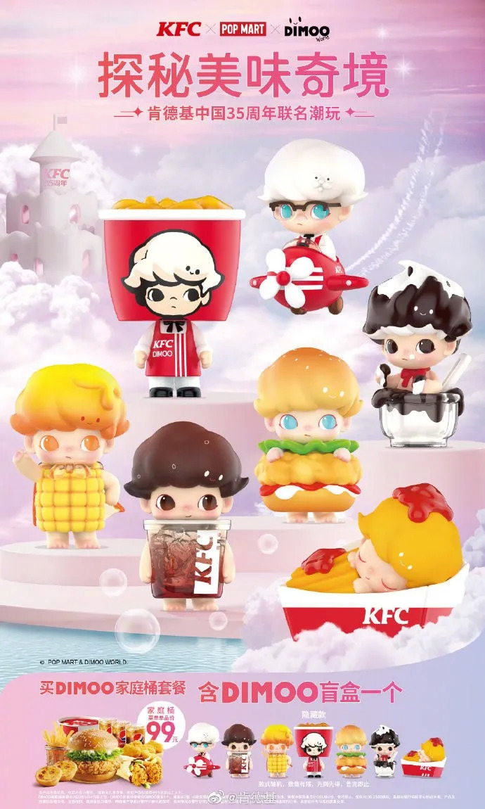 這項(xiàng)于上周開始的活動,其活動細(xì)節(jié)是顧客購買肯德基99元的家庭桶套餐,即可獲得肯德基中國35周年的KFC×DIMOO限定款系列手辦一個。這套限定款盲盒以泡泡瑪特旗下最受歡迎的自主IP產(chǎn)品DIMOO為原型,參考肯德基旗下包括漢堡、薯?xiàng)l、玉米、圣代、咖啡、炸雞桶等知名產(chǎn)品進(jìn)行全新設(shè)計(jì),其中頭戴炸雞桶帽子的王牌炸雞店長DIMOO是隱藏款。除了購買家庭桶,顧客還可以購買KFC×DIMOO的大神卡,獲得抽取售價399元的總共500套聯(lián)名限定款端盒的機(jī)會。